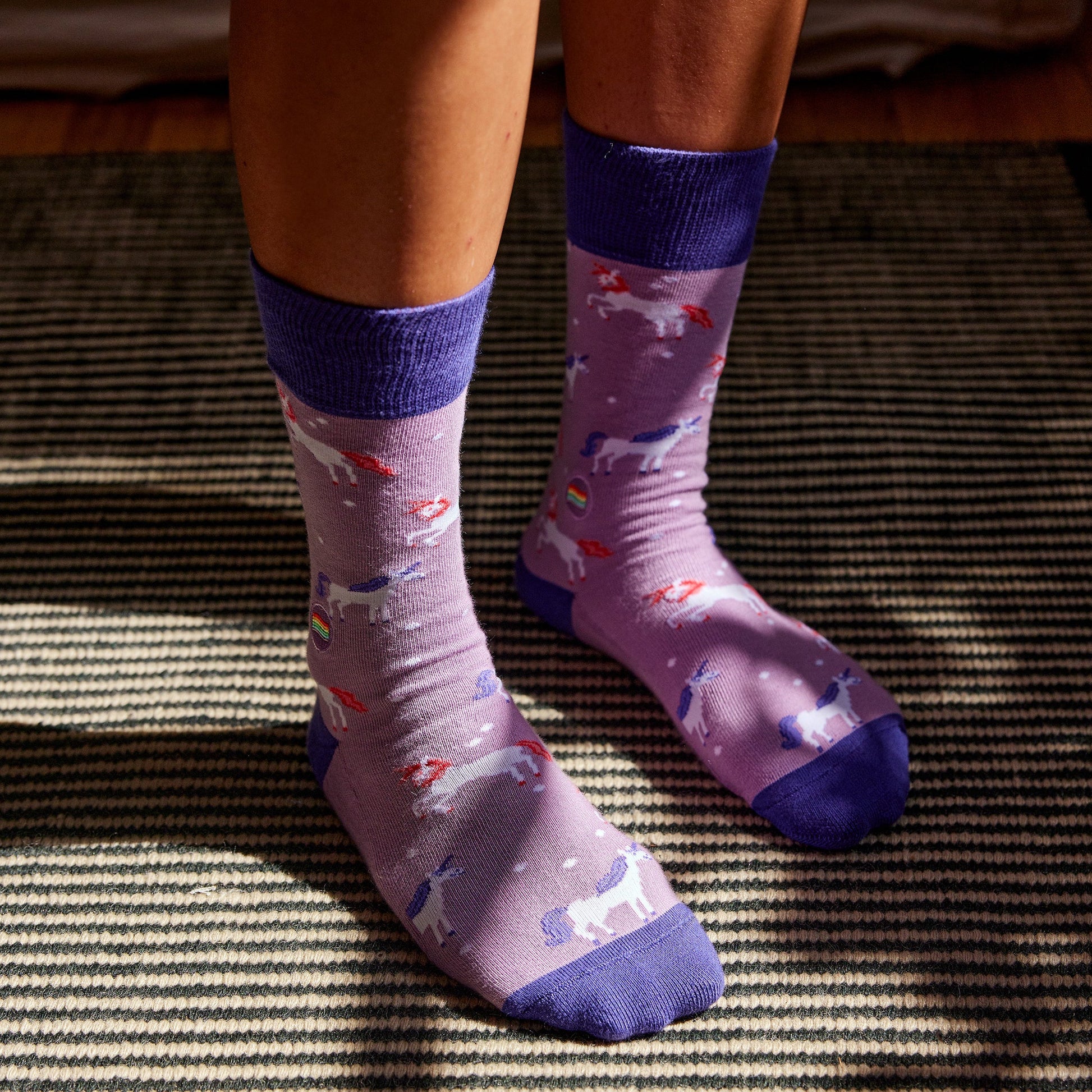 Let your inner sparkle shine with these light and dark purple socks! Put a little extra magic into your step with this pair’s whimsical pattern of leaping unicorns and tiny stars.