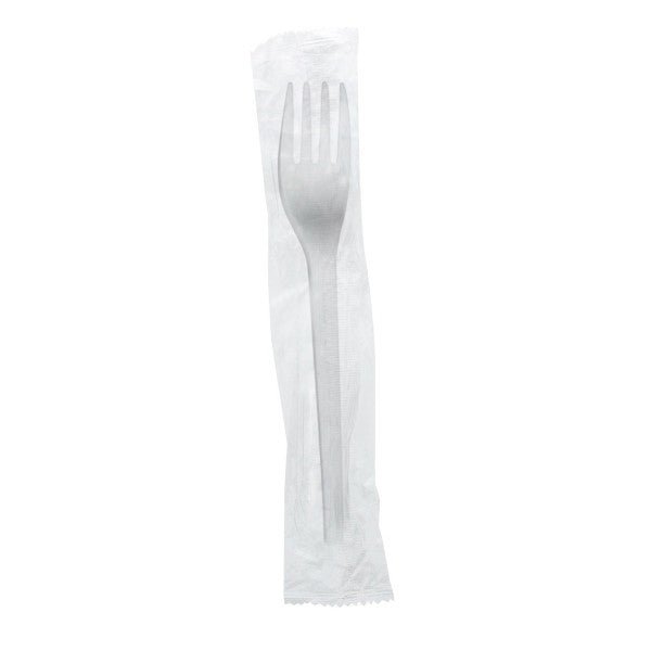 Sturdy 6.5in fork in clear compostable wrap. Great for hot or cold, and sturdy and strong enough to set into crunchy meals. Made from CPLA, a renewable material made from plants. White color knife wrapped in a clear compostable wrap. Award-winning quality by Vegware, made from plants. Designed for industrial composting.