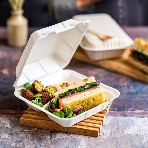 8in heavyweight 3-compartment molded fiber clamshell. For cold or hot food - street food, fried rice, salads, or even sweet treats. Made from reclaimed natural fiber, a material with great thermal properties. White. Award-winning quality by Vegware, made from plants. Designed for industrial composting.